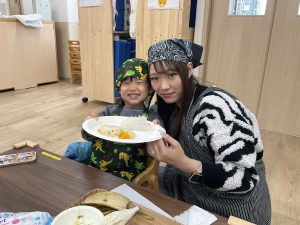 1種類目はバナナとみかんと生クリームで作るフルーツクレープ。みんなが大好きなバナナやみかんを生地にのせて、美味しそうなクリームをペロッと味見!「おいし〜い」子どもたちの笑顔が沢山みられました♪