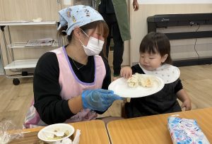 2種類目は照り焼きチキンのクレープ!!美味しそうなお肉とキャベツを生地にのせて、パパとママと上手にまけるかなー?親子で協力して上手にクレープが巻けました。最後に自分で作ったクレープをパパやママと一緒に美味しくいただきました♪とても楽しいクッキングでしたよ!!