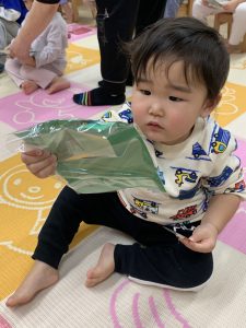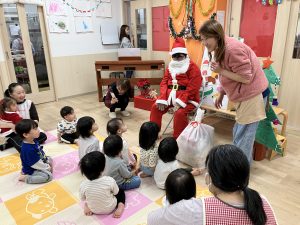 サンタさんが大きな袋を抱えてみんなにプレゼントを持ってきてくれたのでひとつひとつ出して紹介すると目をキラキラさせて見ていましたよ。