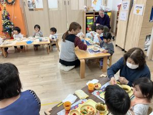 給食もクリスマスのメニューでいつもと違うテーブルの位置でみんなで美味しくいただきました。