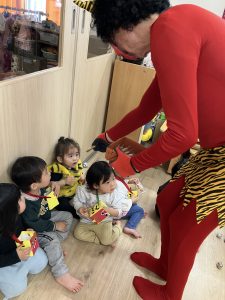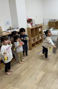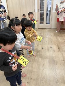 優しい鬼だったので、あまり泣かずに豆まきができた子、やっぱり怖くて泣いてしまった子、怖いけどお菓子は鬼の顔を見ないで受け取った子(笑)など様々でした。