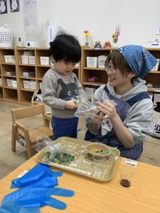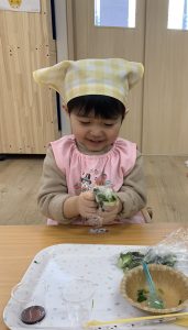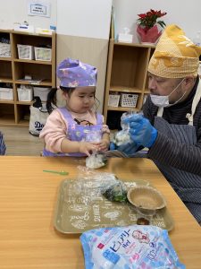 おにぎりを握ったり、お味噌を溶かしたりなど初めて経験したお友達もいて楽しんで参加してくれました。