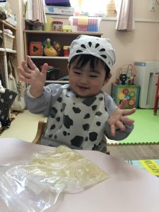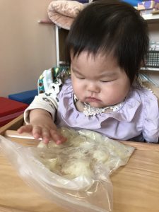 始めは「これ、何だろう?」と不思議そうな顔をしていた子どもたちでしたが、触るのに慣れてくると、ちぎったりつぶす感触を楽しんでいました。