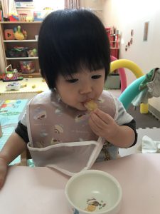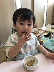 みんなでちぎった白菜とつぶしたじゃがいもは、おやきにしてもらいました。おいしくておかわりをして食べていましたよ。食育を通して、いろんな食材に興味をもち、おいしく食べられるといいなと思います。